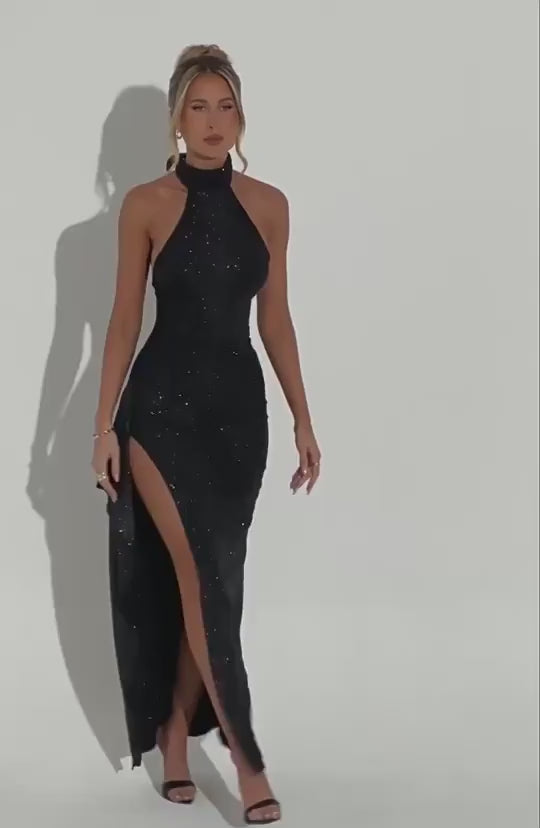Laissez-vous éblouir par cette robe noire scintillante qui allie sophistication et sensualité. Sa coupe sirène souligne la silhouette avec élégance, tandis que l'ouverture fendue sur la jambe et le col haut offrent un équilibre parfait entre audace et raffinement. Une pièce incontournable pour briller lors d’un gala, d’un mariage ou d’une soirée habillée.